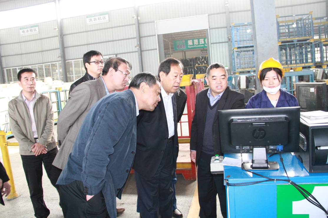 圖二 許開華董事長(右二)向劉長順主任(左三)一行介紹電子廢棄物信息錄入系統