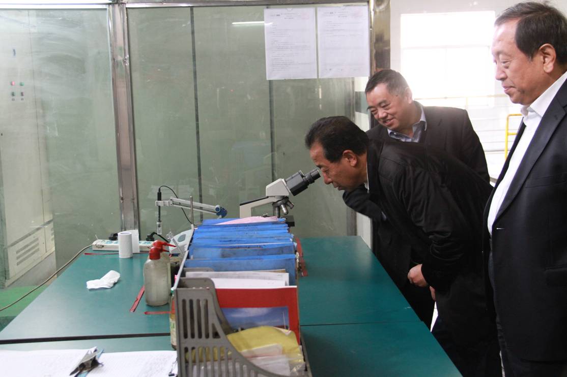 圖四 許開華董事長邀請天津市靜海縣政協主席劉建國(中間)觀察格林美制備的球形鈷材料的微觀形貌