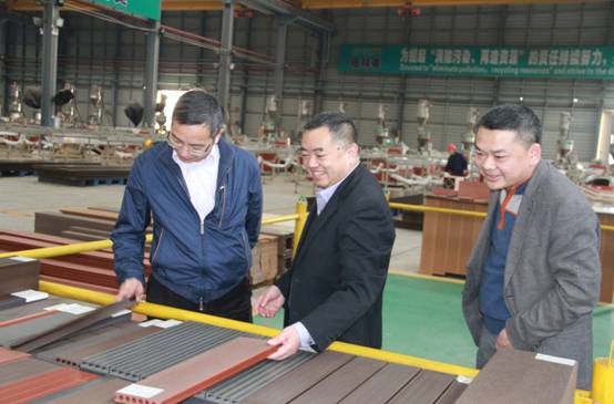 圖四、許開華董事長(中)帶領聞利華董事長(左一)一行參觀塑木型材車間