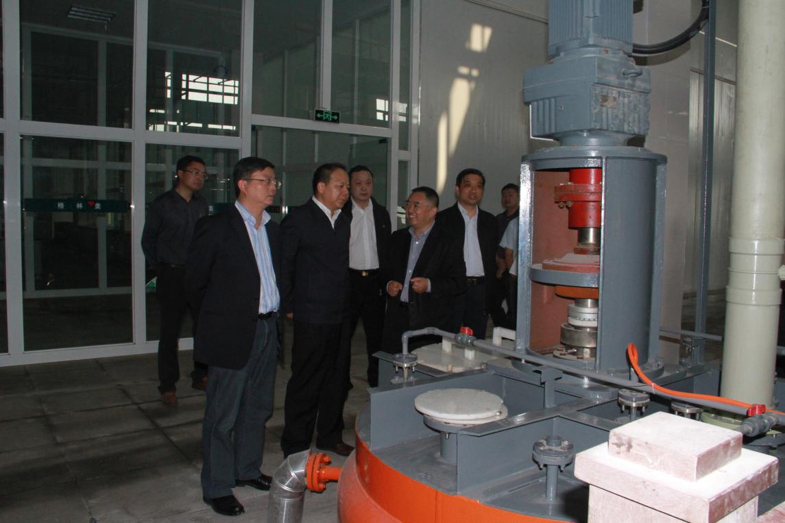 圖二 許開(kāi)華董事長(zhǎng)(右二)向萬(wàn)勇書(shū)記(左三)介紹三元?jiǎng)恿﹄姵夭牧锨膀?qū)體生產(chǎn)線設(shè)備