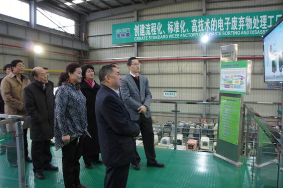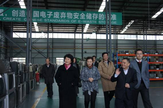 圖2 劉艷榮巡視員(左一)、沈竹林處長(右一)在省發改委荊奇副巡視員(后左一)、高技術處董宏斌處長(左三)、尚曉麗副處長(后左二)和董事長許開華教授、王敏常務副總陪同下參觀格林美電子廢棄物倉庫