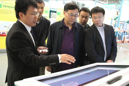 圖二:焦華總(左一)向郝建董事長(zhǎng)(中)一行介紹物聯(lián)網(wǎng)回收信息終端