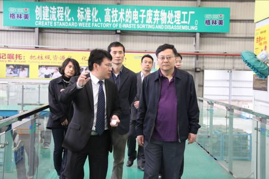圖一:焦華總(左一)向郝建董事長(zhǎng)(左二)一行介紹格林美電子廢棄物回收模式