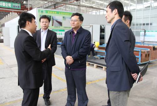 圖四:焦華總(左一)向郝建董事長(zhǎng)(中)一行介紹塑木型材的生產(chǎn)工藝
