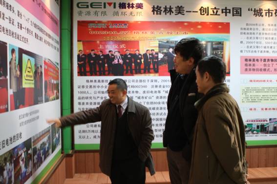在格林美武漢分公司循環(huán)展廳,董事長(zhǎng)許開華教授向到訪領(lǐng)導(dǎo)介紹了格林美幾年來在“城市礦產(chǎn)”開采與利用實(shí)踐、不斷提高資源綜合利用水平所取得的成果,并展望未來,介紹了公司在發(fā)展以電子廢棄物為主體的循環(huán)產(chǎn)業(yè)戰(zhàn)略發(fā)展構(gòu)想。
