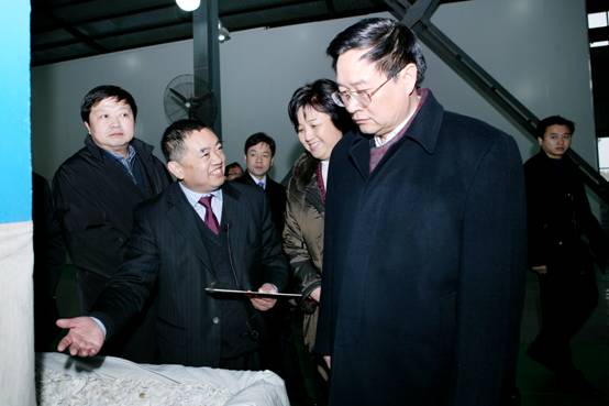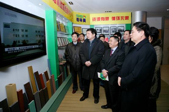 圖一 湖北省委副書記、代省長王國生(左二)在省政府秘書長傅德輝(左三)、省經委主任歐陽萬坤(右一)和荊門市委書記王玲(左一)等陪同下,參觀格林美荊門循環產業展廳,圖為王國生和董事長許開華教授親切交談