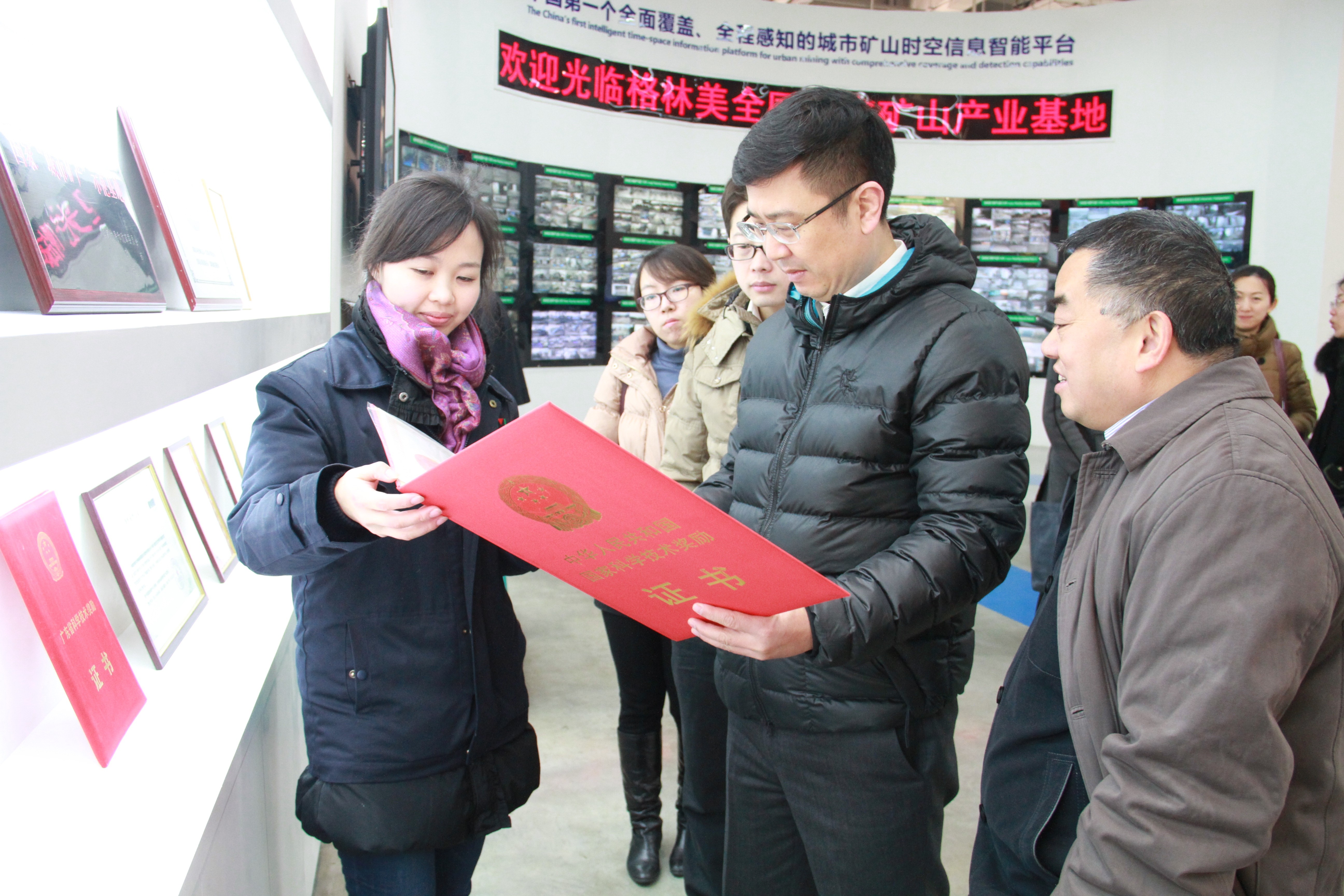 圖二 中節(jié)能安總一行觀看格林美榮獲的“國家科技進(jìn)步獎(jiǎng)”等獎(jiǎng)項(xiàng)