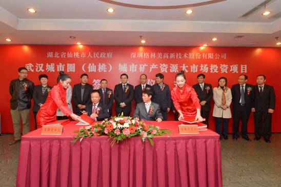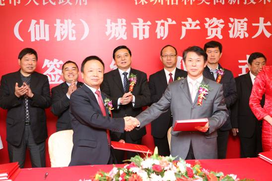 ??? 2012年11月6日上午,深圳市格林美高新技術股份有限公司和仙桃市人民政府在仙桃市天誠大酒店舉行了武漢城市圈(仙桃)城市礦產資源大市場投資項目簽約儀式。湖北省商務廳副廳長陳華志、仙桃市委副書記、市長馮云喬、格林美董事長許開華教授等相關領導出席簽約儀式并發表了重要講話。