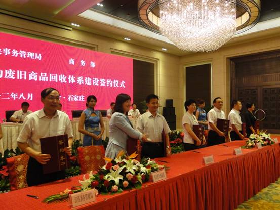 ?????? ?2012年8月16日,國家商務部、國管局在石家莊組織8家試點省市的回收企業和機關服務管理部門簽約,合作建設公共機構廢舊商品回收體系,國管局公共機構節能管理司司長何長江和商務部流通發展司副司長王旭斌參加了此次簽約儀式。武漢格林美資源循環有限公司總經理王健代表公司參加了簽約儀式,并代表回收企業發言。