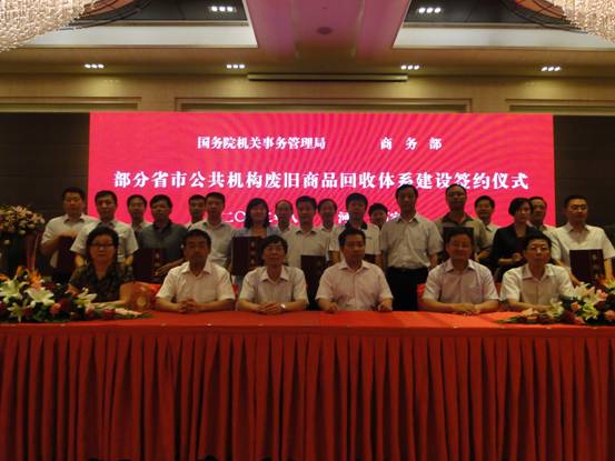 ??????? 簽約儀式上,河北、遼寧、吉林、安徽、江西、山東、湖北、重慶等8個試點省市分公共機構節能管理部門分別與對接企業簽約,協議雙方將在本地區合作推動公共機構廢舊商品回收體系建設工作,開展廢棄電器電子類資產、廢紙、廢塑料、廢舊節能燈、廢鉛酸(鋰)電池等廢舊商品的分類收集和科學處理。?