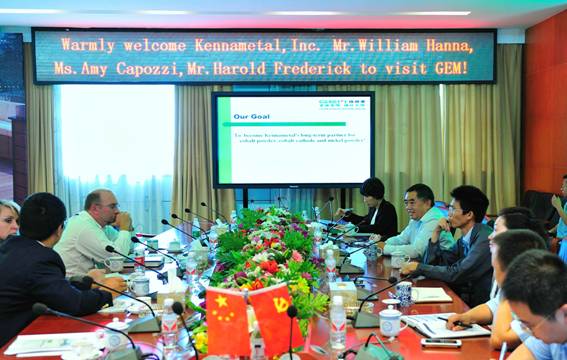 ????? 2012年9月12日,美國肯納金屬公司Mr. William Hanna, Ms. Amy Capozzi,Mr. Harold Frederick蒞臨荊門格林美城市礦產資源循環產業園進行考察調研,格林美董事長許開華、常務副總王敏陪同客人考察了荊門格林美分析檢測中心、電子廢棄物車間、鈷粉生產車間、特種鈷粉制造車間、研發中心、稀貴金屬車間以及德威格林美。參觀完畢后雙方進行了座談交流。