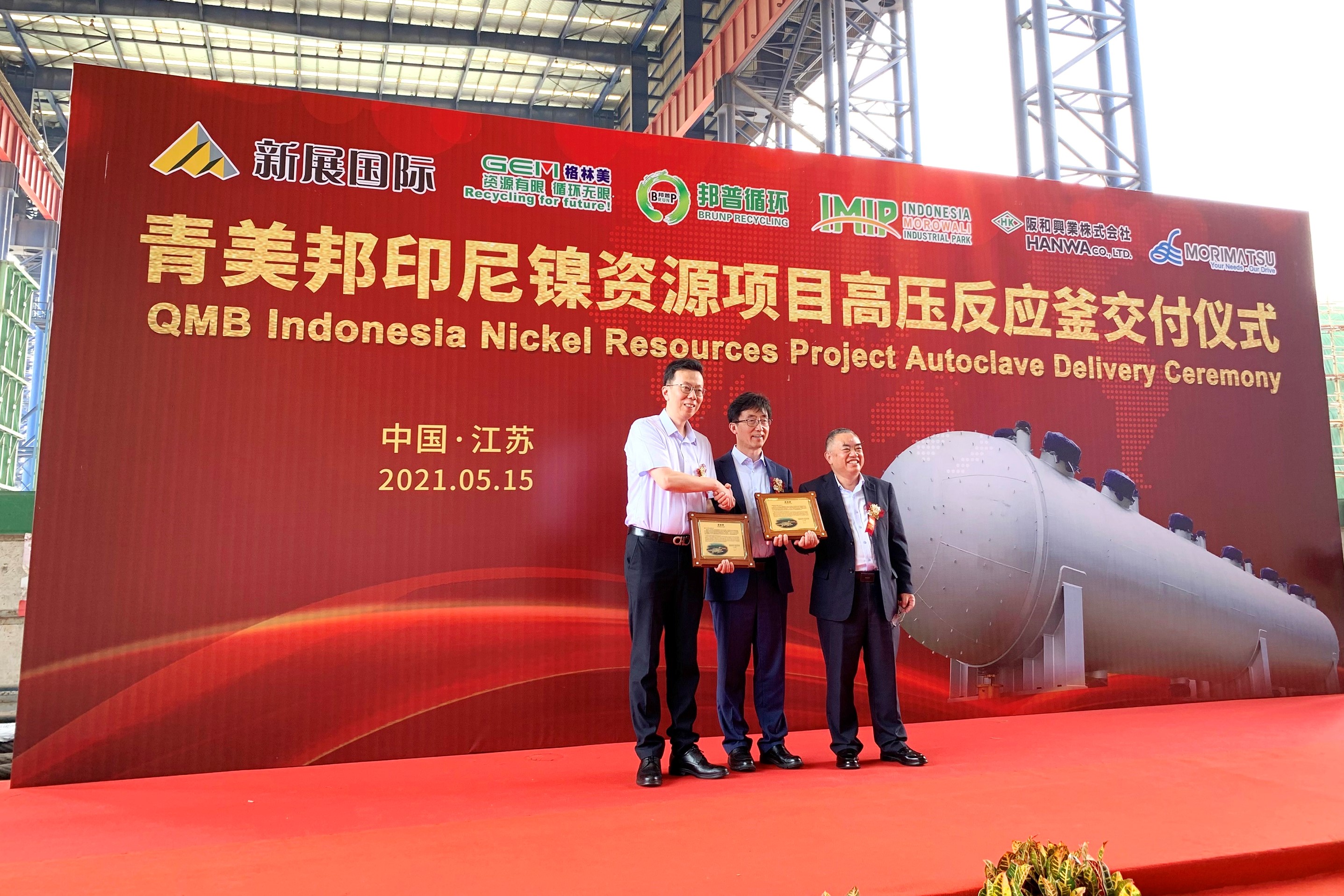 2021年5月15日上午,由格林美控股的青美邦新能源材料有限公司(以下簡稱“青美邦公司”)鎳資源項目濕法冶煉核心設備——3臺560m3高壓反應釜交付暨裝船發運儀式,在江蘇南通森松碼頭隆重舉行。青美邦公司股東代表、格林美集團董事長許開華教授、森松(江蘇)重工有限公司代表、上海鼎信投資(集團)有限公司代表等各方領導出席儀式,共同見證中國重器揚帆啟航、走出國門,在世界鎳資源濕法化學冶煉領域乘風破浪,為捍衛中國新能源鎳資源保衛戰擔當歷史使命。這是格林美青美邦印尼鎳資源項目建設進程中的重要里程碑,標志著項目建設正式由土建基礎工程轉向關鍵設備安裝工程階段,拉開了項目建設進入快速道的序幕,將有效保障“2021年內完成項目各項建設與2022年初投入運行”的建設目標。
