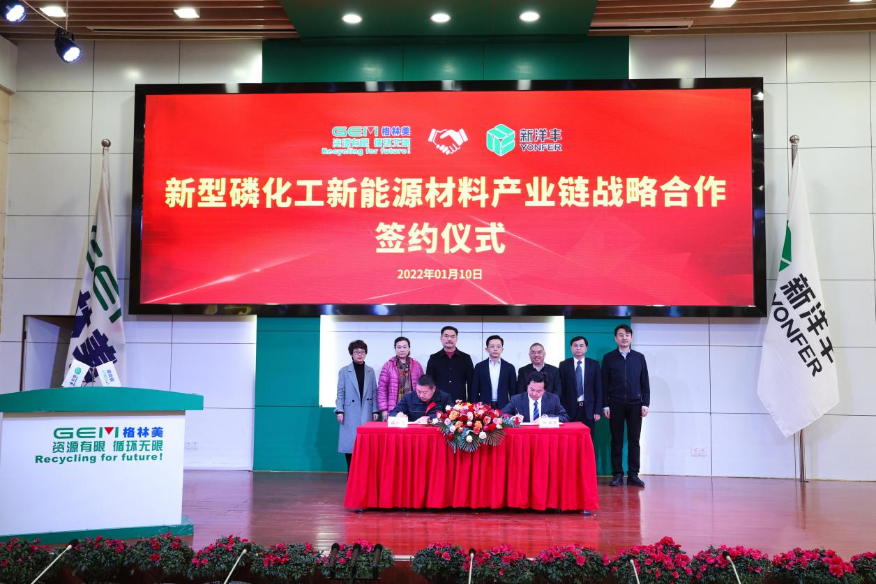 2022年1月10日,格林美股份有限公司(以下簡稱“格林美”)與新洋豐農(nóng)業(yè)科技股份有限公司(以下簡稱“新洋豐”)在格林美荊門園區(qū)正式簽署《磷資源化工新能源材料產(chǎn)業(yè)鏈一體化戰(zhàn)略合作框架協(xié)議》。荊門市人民政府副市長李文震,市政府副秘書長傅強,鐘祥市市長楊孟富,掇刀區(qū)副區(qū)長雙暉,新洋豐董事長楊才學(xué),副董事長、總裁楊華鋒,董事、財務(wù)總監(jiān)楊小紅,以及格林美集團董事長許開華教授,集團聯(lián)合創(chuàng)始人、董事王敏女士等出席簽約儀式。