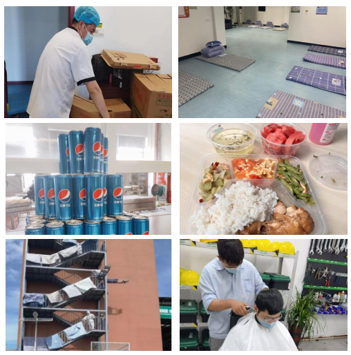 基本食宿問題解決后,為緩解炎炎暑熱,讓每位在廠員工在園區(qū)安心食宿,后勤保障組在保證每天包含肉類、蛋類、蔬菜的營養(yǎng)美味飯菜之外,還精心準(zhǔn)備了西瓜、桃子、飲料、解暑湯等解暑食品,讓員工每日都有小驚喜,在炎熱的天氣為員工帶來一份清涼。為此,大家也戲稱解除閉環(huán)管理,每人都要胖10斤,貼心組織這一切的李媛媛也被稱為“大嗓門管家”。