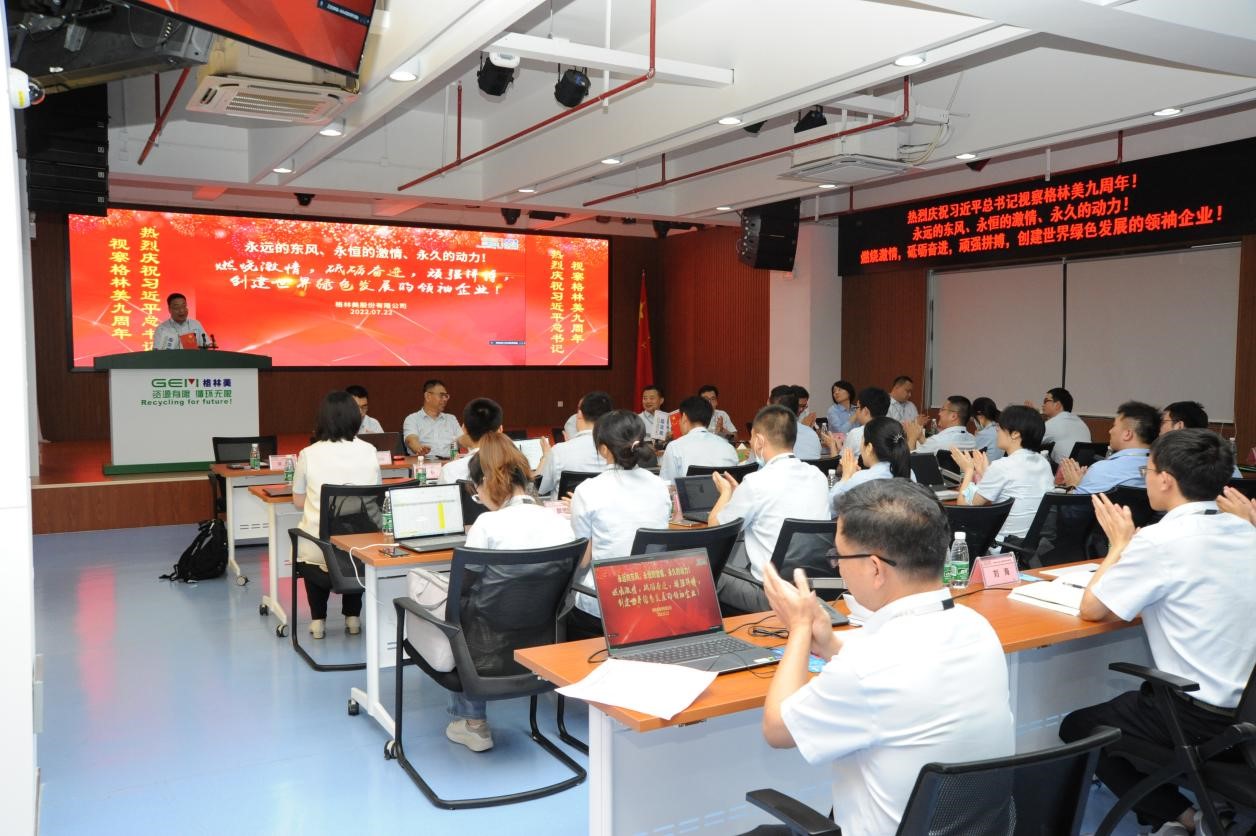 為激勵全體格林美人不忘循環初心,牢記綠色使命,以“搶”、“敢”、“拼”的奮斗精神踐行習近平總書記“把垃圾資源化、化腐朽為神奇”的殷切囑托,策馬揚鞭,燃燒激情,奮戰十四五,突破800億,創建世界綠色發展的領袖企業,2022年7月22日晚上19:00,格林美集團在深圳總部與16個園區隆重舉行習近平總書記視察格林美九周年的慶典活動。集團黨委書記、董事長許開華教授,集團董監高、集團各分子公司負責人、核心管理人員、研究院全體人員、總部全體人員、全體黨員、入黨積極分子以及2022屆新入職大學生等參會。