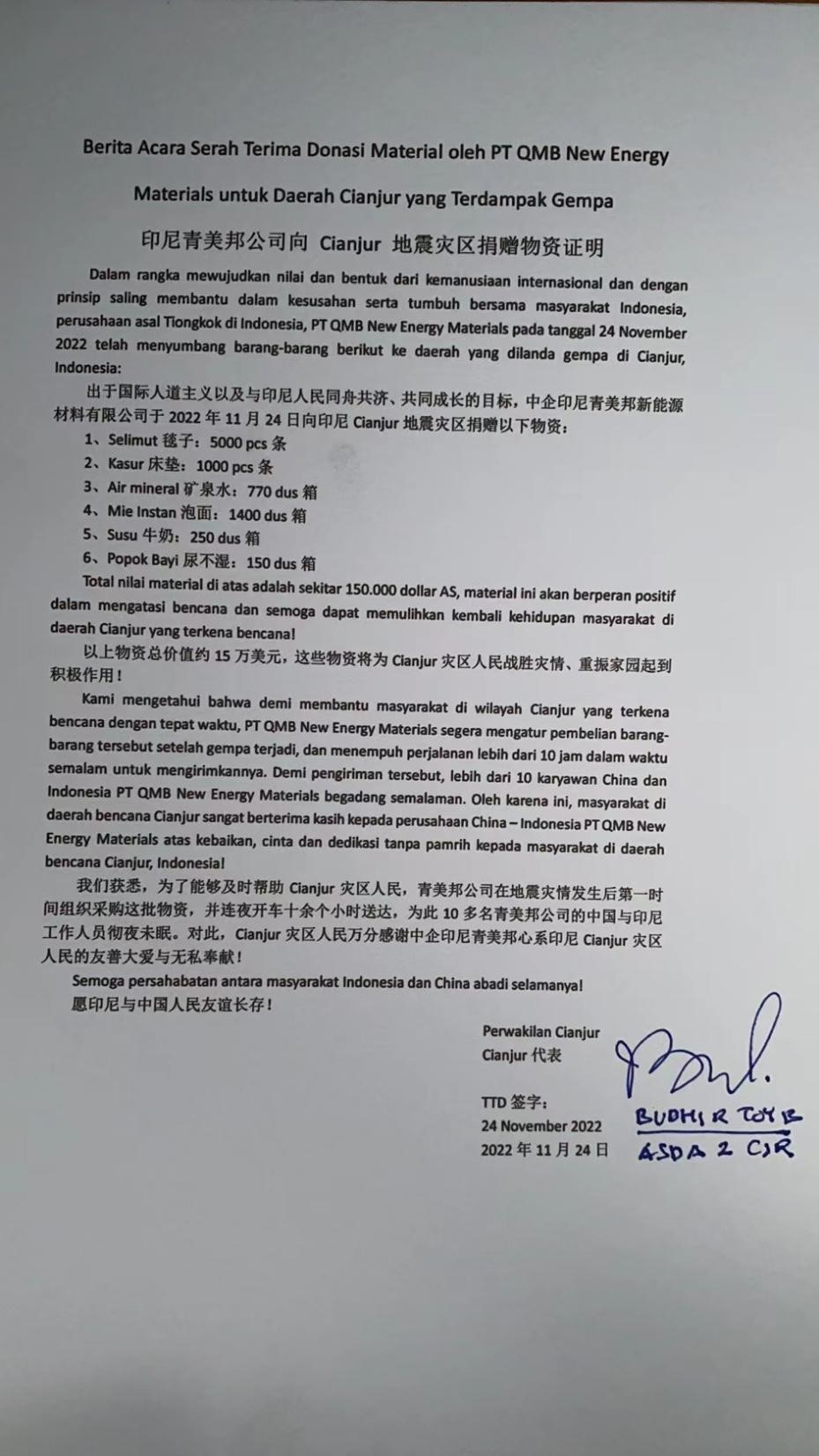 在西爪哇展玉地區(qū)發(fā)生地震災難后,災區(qū)情況時刻牽動著位于印尼中蘇拉威西省莫羅瓦利縣大K島的中資企業(yè)青美邦新能源材料有限公司員工們的心,公司董事長許開華教授夙夜惦記著災區(qū)人民,每時每刻關注災區(qū)動態(tài),對災區(qū)人民的生活十分關切。許開華董事長號召青美邦同仁竭盡所能為災區(qū)人民提供支援,守望相助,與災區(qū)人民共渡難關,同舟共濟共成長。