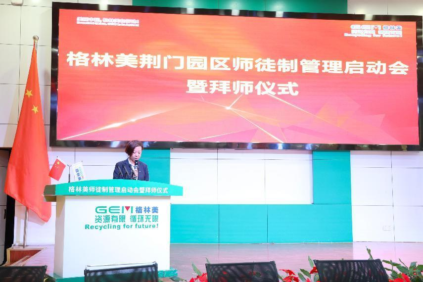 圖2 格林美荊門(mén)園區(qū)管委會(huì)輪值主任馬琳宣讀《關(guān)于荊門(mén)園區(qū)師徒制管理方案的通知》