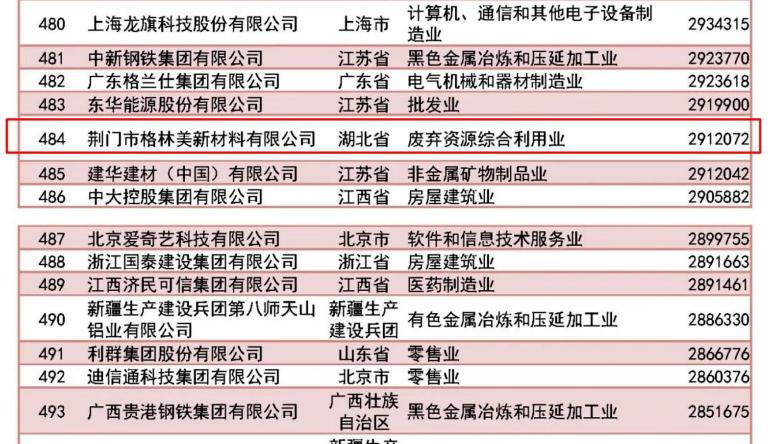 2023年9月12日,全國工商聯發布“2023中國民營企業500強”和“中國制造業民營企業500強”榜單。格林美集團(以下簡稱“格林美”或“公司”)雙喜臨門,下屬荊門市格林美新材料有限公司以營業收入291.2億元,首次躋身“中國民營企業500強”,位列第484名,并再次入圍“中國制造業民營企業500強”榜單,位列第315名,較2022年排名上升59位。