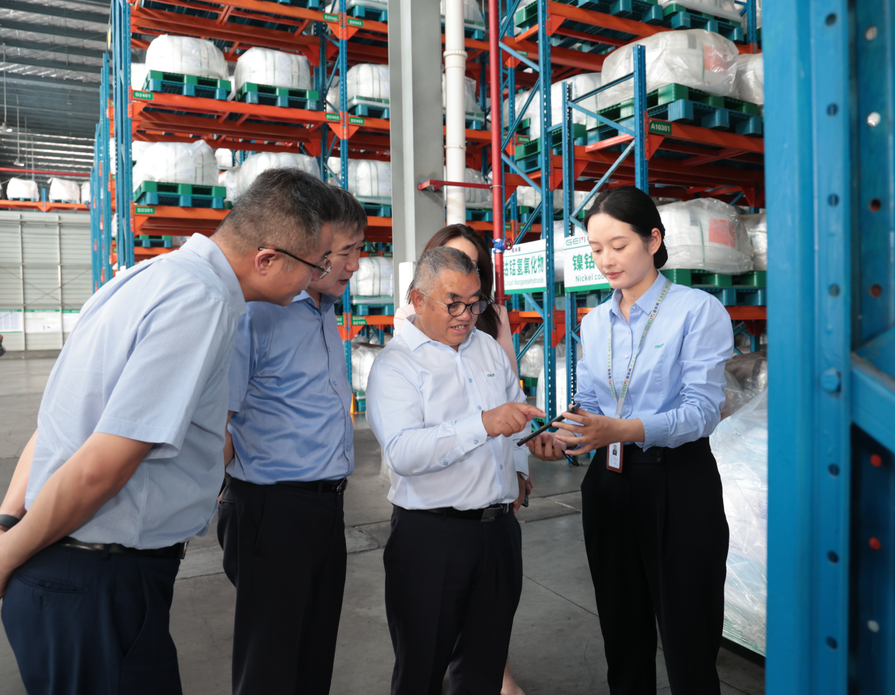 圖4 許開華董事長和陳忠行長(左二)察看格林美即將出口海外的鎳鈷產品