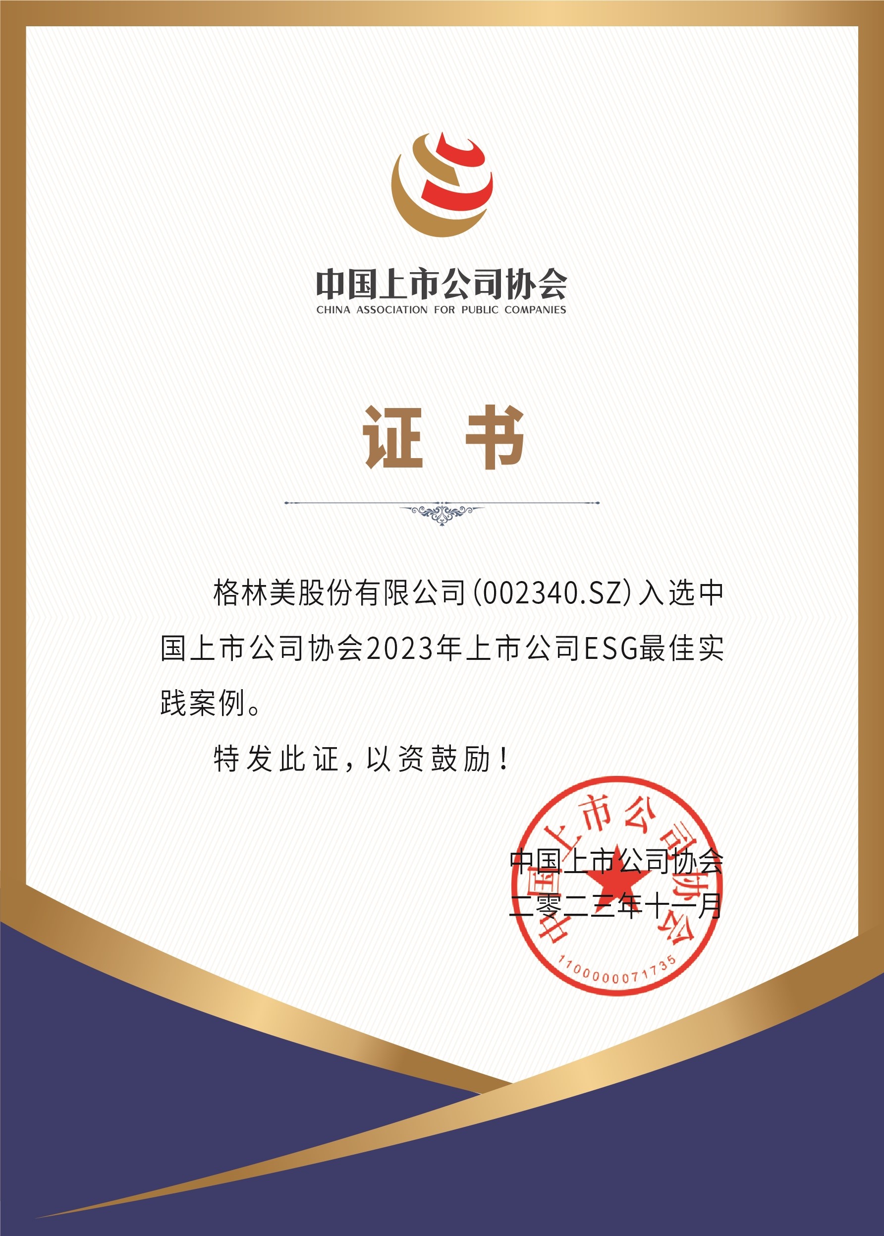 2023年11月16日,由中國上市公司協(xié)會(以下簡稱“中上協(xié)”)主辦的首屆中國上市公司可持續(xù)發(fā)展大會(以下簡稱“大會”)在北京召開。大會發(fā)布了“2023年度上市公司ESG最佳實踐案例”,格林美成功入選,并與中國移動、阿里巴巴、寧德時代、國網英大、蒙牛等著名企業(yè)獲獎案例共同被匯編寫入《中國上市公司ESG最佳實踐案例2023》。