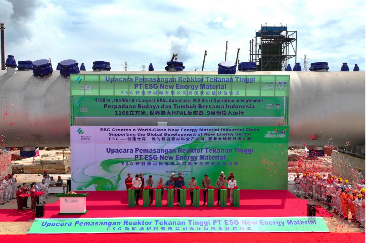 許開華教授在發言中對印尼政府提供的良好的投資環境表示感謝,對Garibaldi Thohir先生與MERDEKA董事長陳傳偉先生的信任與支持深表謝意,對青山董事局主席項光達先生與IMIP園區的大力支持表示感謝,并高度肯定ESG項目建設的格林美團隊與各建設單位團隊以夜以繼日的戰斗精神創造紅土鎳礦HPAL項目建設的全球新速度!ESG項目從設計到完成全部核心工序的基礎建設僅用時8個月,彰顯了格林美與MERDEKA團隊之間齊心協力,體現了如雅萬高鐵般的建設速度與合作深度。他強調,本次就位的1168m3高壓反應釜,產能可達到2.5萬噸鎳金屬/年以上,代表著先進的裝備技術與高效的HPAL技術。他期望以“綠色礦山、綠色生產、綠色產品”為設計理念來建設“科技+智慧+綠色”的高技術ESG項目,推動印尼紅土鎳礦從冶煉不銹鋼到冶煉新能源材料的綠色跨越,實現“把紅土鎳礦投進去,把新能源材料煉出來”的產業理想,推動印尼鎳工業走向新能源時代!