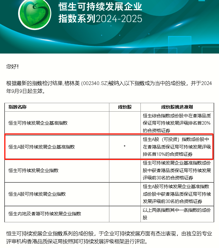 近日,恒生指數有限公司(HSI)發布恒生指數系列最新檢審結果,格林美股份有限公司(股票代碼“002340”,以下簡稱“格林美”)憑借在可持續發展方面的卓越表現,在香港品質保證局可持續發展評級排名首10%的合資格(在355間同行公司中排名前10%,在全部1439間公司中排名前10%),再次被納入恒生A股可持續發展企業基準指數(HSCASUSB)成份股(2024-2025年度),并于2024年9月9日正式生效。