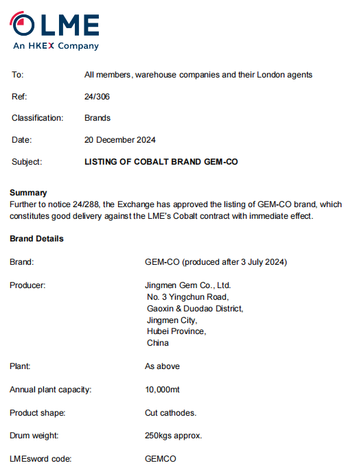 2024年12月20日,格林美全資子公司荊門市格林美新材料有限公司生產的“GEM-CO”牌電解鈷成功在倫敦金屬交易所(LME)完成注冊,注冊項目年產能達10,000噸,2024年7月3日后生產的電解鈷產品即可在LME倉庫履約交割。這是繼2...