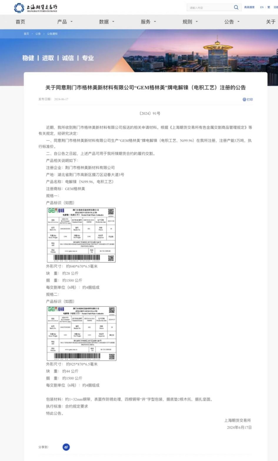 2024年6月17日,格林美集團子公司荊門市格林美新材料有限公司生產的“GEM格林美”牌電解鎳(電積工藝,Ni99.96)成功在上海期貨交易所完成注冊,注冊產能為3萬噸。這是繼2023年11月,格林美電解鎳品牌GEM-NI1、GEM-NI2成功注...