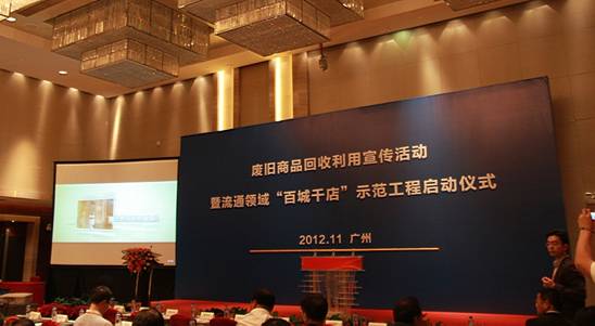 ??? 2012年11月9日,圍繞“廢品回收人人參與,循環(huán)發(fā)展家家受益”宣傳為主題的廢舊商品回收利用宣傳活動(dòng)暨流通領(lǐng)域節(jié)能環(huán)保“百城千店”示范工程啟動(dòng)儀式在廣州舉行。有關(guān)部門、協(xié)會(huì)和企業(yè)代表近200人參加啟動(dòng)儀式。商務(wù)部副部...