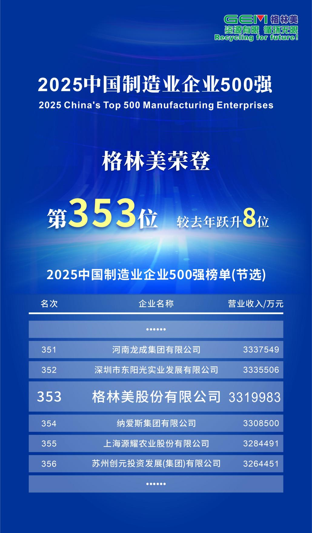 9月20日,在世界制造業(yè)大會上,中國企業(yè)聯(lián)合會、中國企業(yè)家協(xié)會聯(lián)合發(fā)布2025中國制造業(yè)企業(yè)500強榜單。格林美位列第353位,較去年(第361位)上升8位。2024年,格林美在全球行業(yè)競爭中正確洞察局勢、精準(zhǔn)出招、踏浪前行,推動...