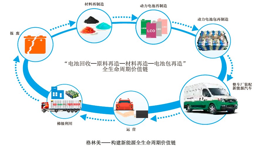 2015年,格林美開創性地首次提出“新能源全生命周期價值鏈”的構想:以動力電池材料循環再造為核心,對失效的動力電池進行回收、拆解破碎、分選、化學提純、三元動力電池材料再制造,生產出品質一流的動力電池前驅體和正極材料,然后交給電池生產企業進行電芯制造以及電池包制造,再由汽車制造企業進行裝配、運營。