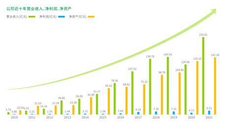 2021年,格林美各項業(yè)務產(chǎn)能大釋放,經(jīng)營效益大增長,營業(yè)收入193.01億元,同比增長54.83%;凈利潤9.23億元,同比增長123.82%。格林美自2010年上市以來,持續(xù)快速增長,業(yè)績一路飆升,營業(yè)收入提升近34倍,凈利潤提升近11倍,凈資產(chǎn)提升超13倍,成功塑造了一個世界低碳循環(huán)產(chǎn)業(yè)傳奇。