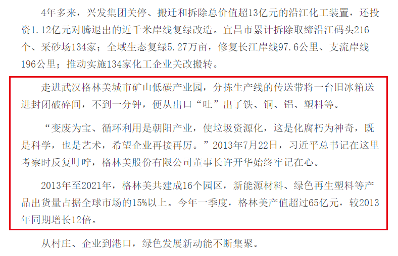 6月13日,人民日報《奮力譜寫新時代高質量發展新篇章(沿著總書記的足跡·湖北篇)》登載了格林美的綠色循環產業成就
