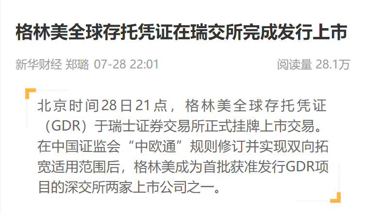 7月28日,新華社·新華財經欄目發布文章《格林美全球存托憑證在瑞交所完成發行上市》