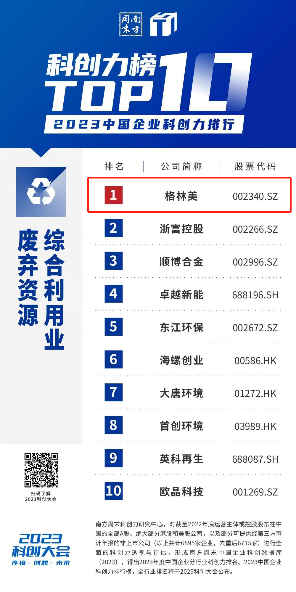 2023年9月25日,南方周末發(fā)布2023年度中國科創(chuàng)力排行榜,格林美位居廢棄資源綜合利用業(yè)TOP1。
