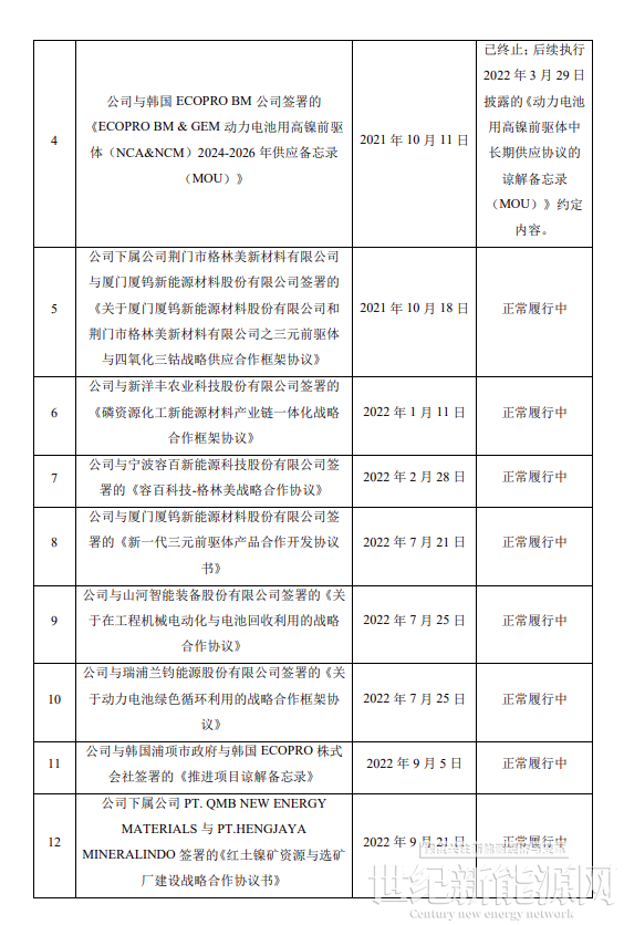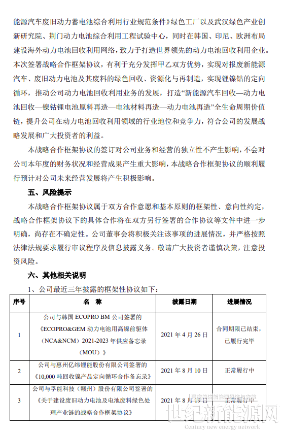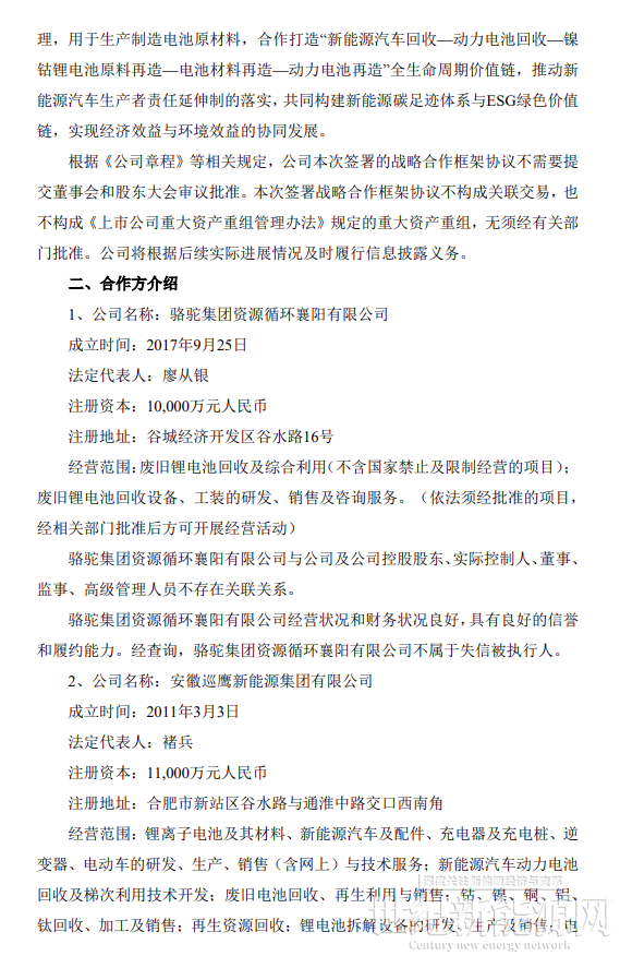 根據公告顯示,格林美股份有限公司控股子公司武漢動力電池再生技術有限公司分別與駱駝集團資源循環襄陽有限公司、安徽巡鷹新能源集團有限公司、河南中鑫新材料有限公司、湖南五創新能源科技有限公司、美華新材料(湖北)有限公司(以 下均稱為“乙方”)于2024年3月8日簽署了《關于共同構建新能源全生命周期價值鏈的戰略合作框架協議》。