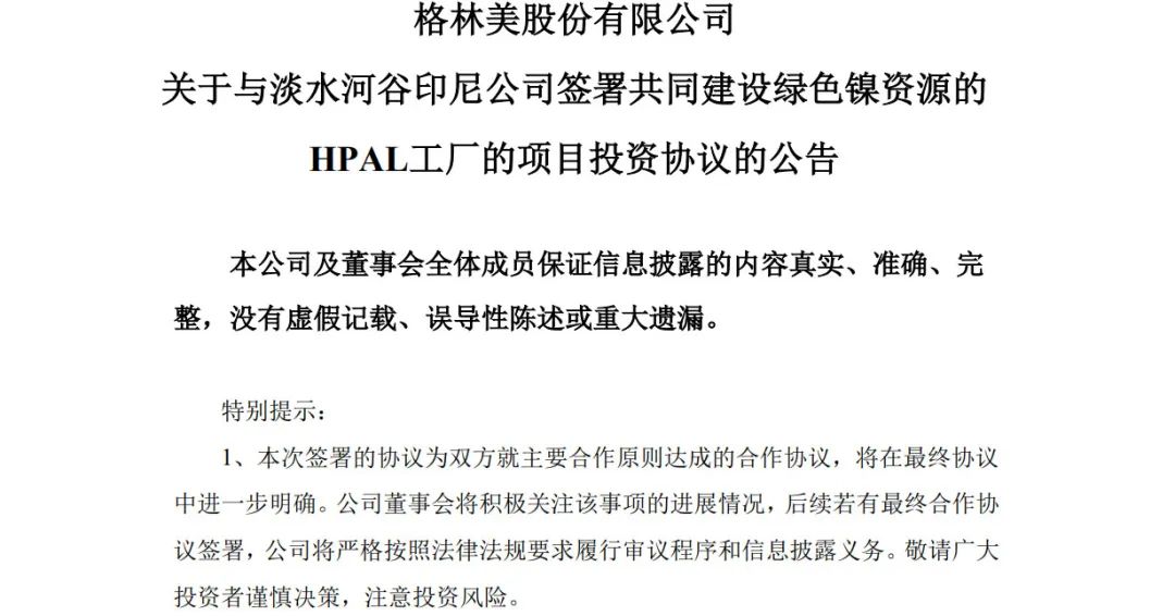 11月10日,格林美公告稱,與淡水河谷印尼公司(PT Vale Indonesia Tbk)簽署協議,雙方將在印尼建造一個鎳資源冶煉廠。