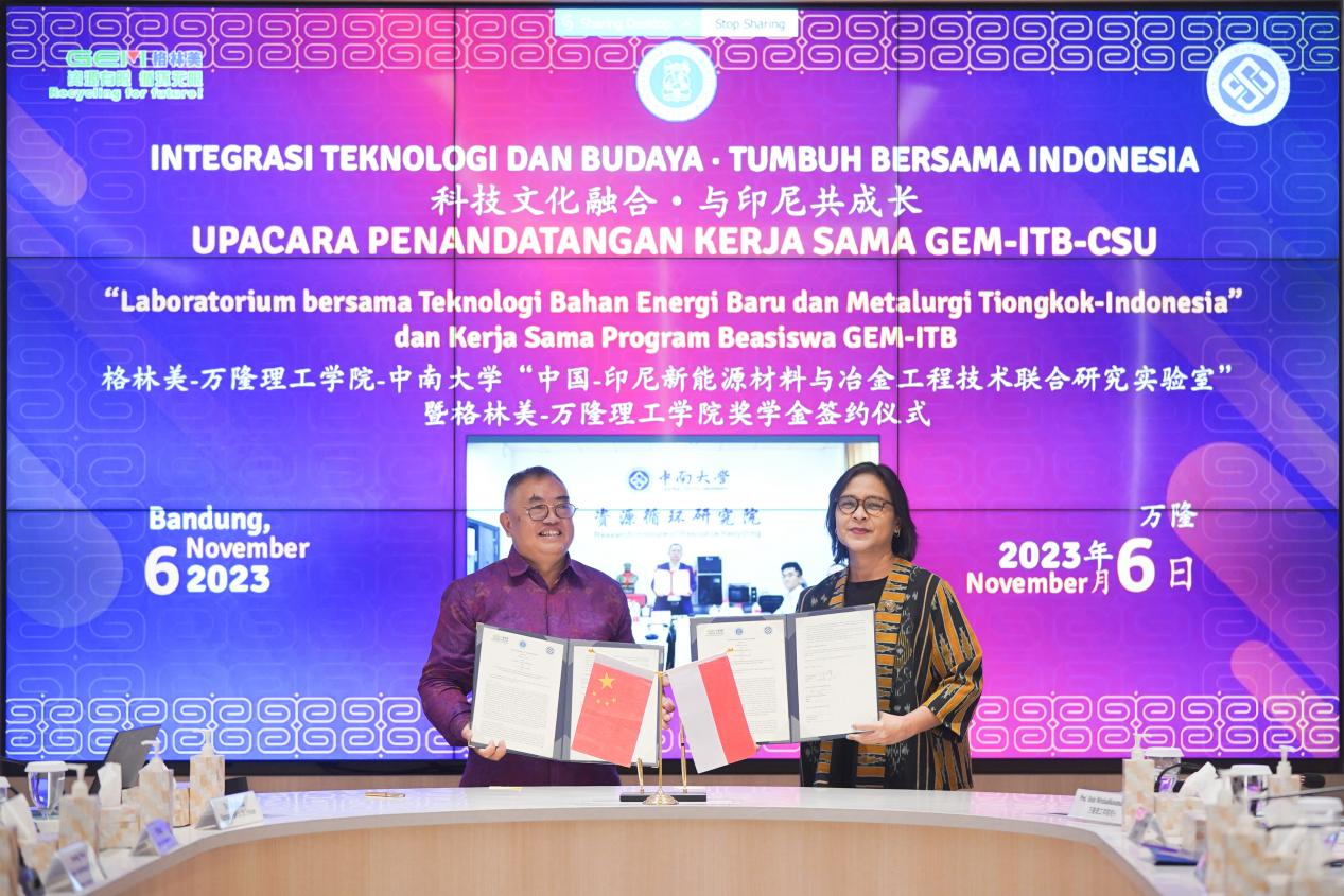2023年11月6日,格林美、中南大學與印尼萬隆理工學院(被譽為印尼的清華大學)簽署“中國-印尼新能源材料與冶金工程技術聯合研究實驗室”合作諒解備忘錄。聯合實驗室將由格林美出資1500萬美元,旨在創建世界一流的工程技術聯合實驗室,在關鍵礦產資源開發、新能源材料、資源循環利用、綠色技術、ESG與可持續發展等領域展開創新研究,為印尼電動化戰略、為印尼礦業高質量開發提供關鍵技術支撐,為構建全球人類命運共同體做出貢獻。這是中國大學與中企聯合在印尼設立的第一個聯合實驗室。
