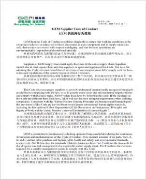 為踐行自身以及供應鏈的可持續發展道路,格林美提倡與供應商建立長期穩定的誠信合作關系,鼓勵供應商履行社會責任,共同推進負責任供應鏈的建設。格林美參考 OECD 指南、中國指南和工商業與人權制定了格林美《關于負責任采購的供應商標準》、《GEM 供應商行為準則》、《格林美負責任全球供應鏈的盡責管理政策》,其中概述了勞工和人權、健康及安全、環境、道德等要求,并將這些條款運用到格林美供應商的評估和準入中,我們將積極地監管供應商的合規性,任何違反標準的行為可能會損害雙方關系,甚至導致終止雙方業務關系。